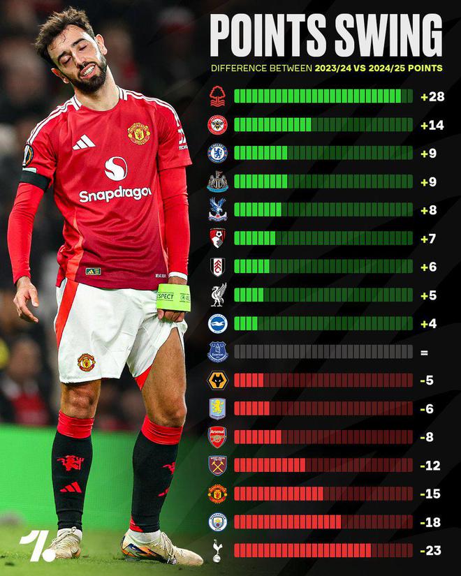 值得注意的是积分下跌情况,图表显示最后倒数三位分别是曼联、曼城和热刺,相较上赛季同期分别减少了15分、18分和23分。目前曼联积38分排名第14,曼城多赛一场积61分排名第3;而热刺则积37分,只排到英超第16位。